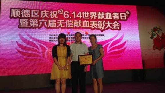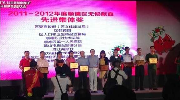 6月15日晚,顺德区人民政府在顺峰山公园举行庆祝“6•14”世界献血者日暨顺德区第六届无偿献血表彰大会,庆祝世界献血者日并表彰无偿献血先进单位和个人,太阳官网荣获了2011-2012年度顺德区无偿献血“先进集体奖”。