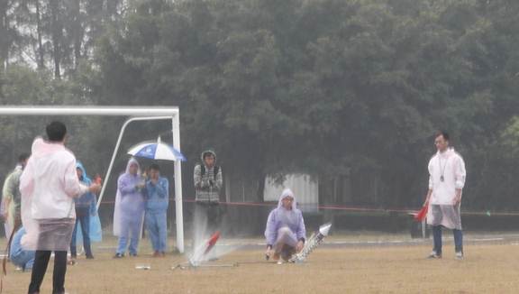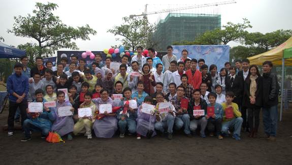 中国移动通讯集团广东有限公司佛山分公司相关负责人、校团委办公室相关老师、机电工程学院相关老师、各学院团委代表、参赛者以及300多名师生为大赛加油助威。虽然整场决赛在寒冷的小雨中进行,但一点不减同学们对大赛的热情。主持人一声发令下,由中国移动通讯集团广东有限公司佛山分公司相关负责人以及校团委办公室老师共同发射 “超级水火箭”,直飞至十层楼高的高空。与上一届大赛不同的是,决赛飞行分为A赛和B赛,分别测试水火箭45度角发射的水平射程和水火箭垂直发射的空中时长,要求参赛队伍制作的水火箭有全面、综合的飞行技能。水火箭一轮轮出色的飞行都赢来了现场观众的阵阵掌声和欢呼声,更有水火箭一度创出了73.9米水平射程的最好成绩。紧接而来的是大赛与现场观众的互动环节----现场抽奖与冠军竞猜活动,现场观众的积极参与把气氛一次次推向高潮。最后,经过一个多小时的飞行决战,“飞”凭借它精致的外形设计、全面的飞行技能荣获一等奖,“蚊子”、“抚摸白云”荣获二等奖,“二号”、“R10”、“追梦队”荣获三等奖,“机电3一号”以其突出的设计理念、独特抢眼的外型设计获得了“最佳创意奖”。