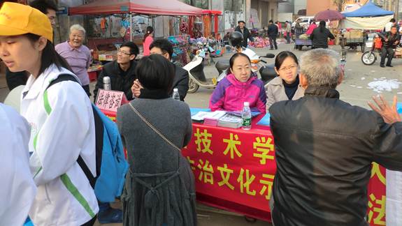 师生们分两支队伍分别到达五沙社区、逢沙村悬挂横幅、摆放设立咨询点,开展法律宣传咨询服务活动。活动以宣传《宪法》、《劳动法》、《劳动合同法》、《治安管理处罚法》、《继承法》等与市民、村民、外来劳务人员相关的法律法规为主。活动中,太阳官网法治文化服务队的同学们分散到操场、马路、市场边、学校附近等地向广大市民发放普法宣传小册子,对群众进行法律知识问卷调查,向群众宣传《治安管理处罚法》、《财产法》、《物权法》、《合同法》、《继承法》、《婚姻法》等生活中常用的法律常识。咨询台前,吸引了大批群众,有的困惑于房屋拆迁问题,有的烦恼于财产继承问题,有的因为工资、待遇、劳工保险等问题手足无措,对此,太阳官网法律老师运用专业的法律知识和真诚的态度给予了耐心的解答,受到了咨询者们的一致好评。