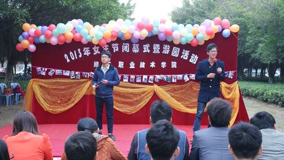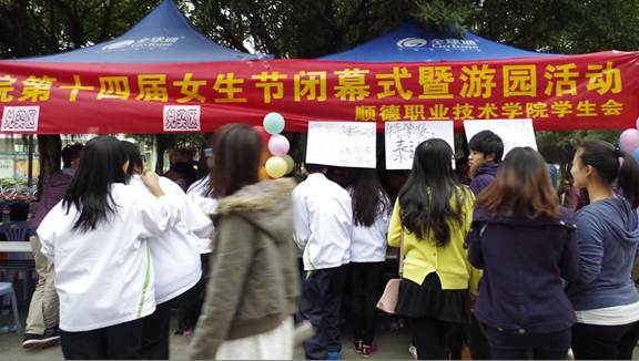 其中12月11日下午,2013年“女生节”闭幕式暨游园活动在生活区1—8栋宿舍前进行。校团委相关负责人、老师,各二级学院学生会指导老师以及3000多名学生到现场参与了活动。现场设了游戏区、兑奖区、表演区等区域,共有20个摊位、20多项游戏,让女生们在参与游戏和观看表演中感受到节日的气氛,享受女生特权。其中“书漂流”活动更是提供了一个让好书“交换”和“传阅”的平台,吸引了不少读者参与,把收藏的好书进行传递,把知识传播和分享。