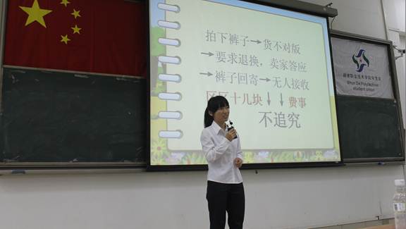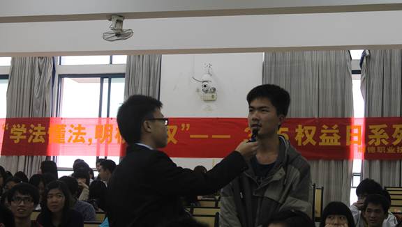 其中,4月2日下午的“3.15”权益日演讲比赛在教学楼11栋201室进行,校团委相关老师、各学院学生会指导老师及200多名同学观看了比赛。来自9个学院的10名同学围绕“学法懂法明权维权”主题,结合自身的消费实际、央视315晚会的相关内容及社会普遍的维权案例进行了演讲,让在场的师生再一次普及了消费者权益保护的相关法律、欣赏了语言与演讲的艺术魅力。比赛期间还穿插了消费者权益保护方面的知识有奖竞猜活动,同学们热情高涨,纷纷举手抢答,加深了对权益保护相关知识的理解。