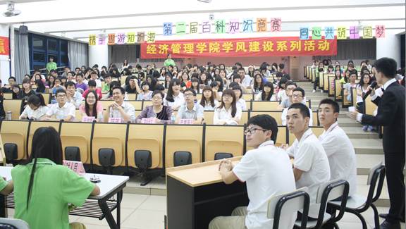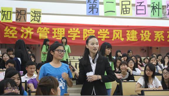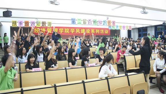 为了进一步加强经济管理学院学风建设,提高大学生的综合素质,4月17日晚,经济管理学院学生会在教学楼8栋300教室举办了以“携手遨游知识海,同心共筑中国梦”为主题的百科知识竞赛。经济管理学院相关负责人、相关教师以及300多名学生出席了本次活动。