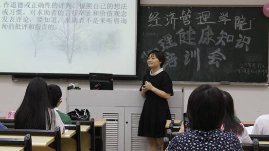 5月22日晚,经济管理学院心理健康协会在教学楼8栋203举办了第一期心理健康知识培训班。校心理健康教育与咨询中心负责人、经济管理学院相关辅导员、2013年级各班班长以及心理健康委员约100人参加了本次活动。