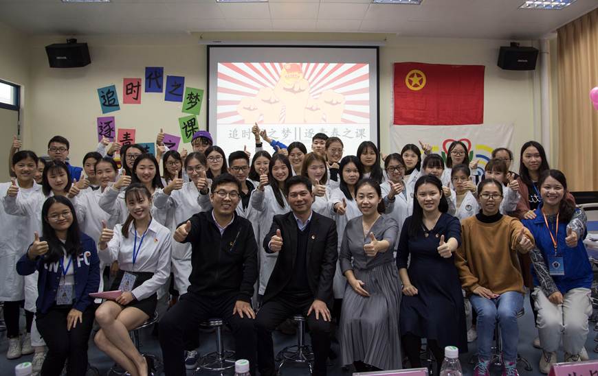 11月28日下午,由校团委主办、医药卫生学院团委承办的“追时代之梦,逐青春之课”为主题的团支部联系日活动在医学楼72301课室成功举办。校团委、马克思主义学院、医药卫生学院相关老师、校团委学生干部代表、2017级药学1班团支部全体成员及院团委相关学生干部共50余人参加了本次活动。