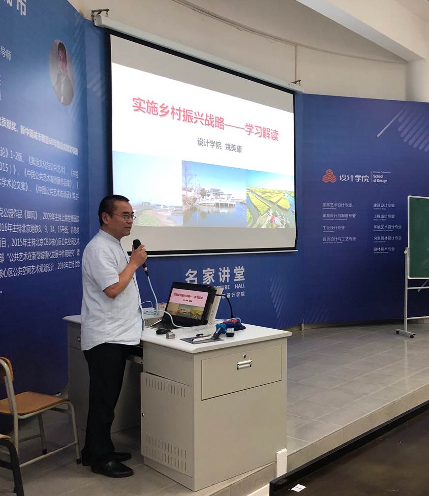 随后,设计学院院长以“实施乡村振兴战略——学习解读”为主题,从乡村振兴背景来源、主要内涵、如何实施乡村振兴战略、国内外乡村振兴典型案例解读为同学们解读新时代乡村振兴战略。同时,结合顺德实际,为同学们分析了顺德北滘林头镇乡村振兴战略安排。