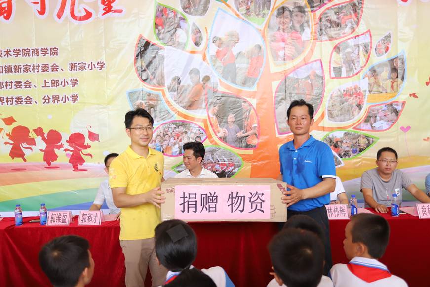 现场为商学院湛江乡村振兴党员实践队进行了授旗,并向新家村移交捐赠物资,为新家小学优秀学生颁发了文具用品。
