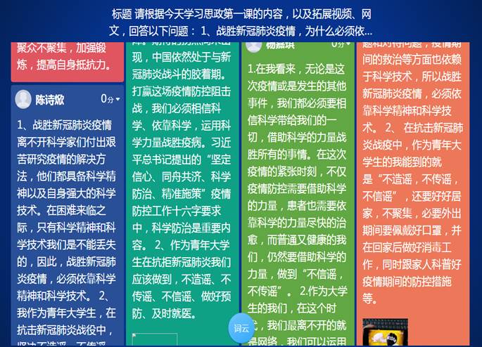 课程结束后,学生纷纷在网络教学平台发表感想,18展示艺术设计2班的潘佳莹同学说:“即使疫情也阻挡不了我们学习的热情,学校开通了网课,这样锻炼了我们自主学习、自觉学习的能力,我也在家里认真学习,为国家‘做贡献’。大家都积极配合国家在特殊时期的安排,足不出户,在一线战斗的英雄们一定能打赢这场没有硝烟的战争。”19级社会工作1班的彭凯欣同学说:“许多人不畏疫情,扛起中国人的责任,毅然赶往前线,成为祖国最靓丽的风景线。”19会计3班的曾怡玮同学说“即使在这样的灾难面前,希望也一直在我们左右,疫情打不倒我们。病魔总会被打败,待到我们摘下口罩,走上街头的那一天,一定会有明媚的阳光等着我们前去拥抱。”19财务管理1班的吴佳娜同学说“上完第一次网课,受益匪浅,能够和同学们一起上课的感觉太棒了,在国难当头的时刻,作为学生,我们应当做到听党话,跟党走,始终相信我们终将战胜疫情!!加油,武汉!加油,中国!!”