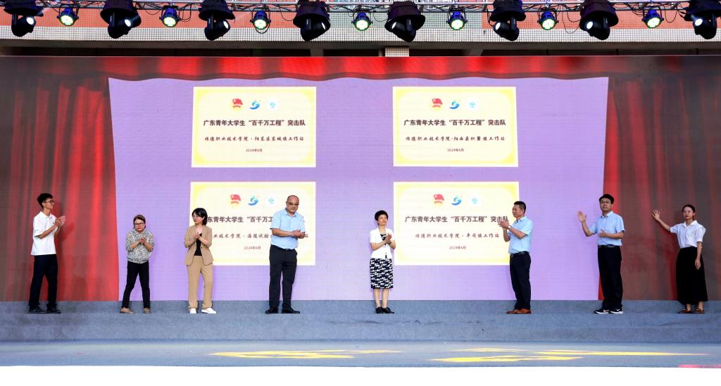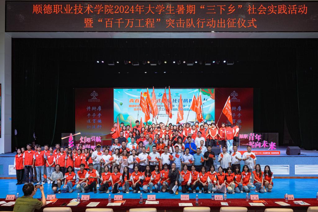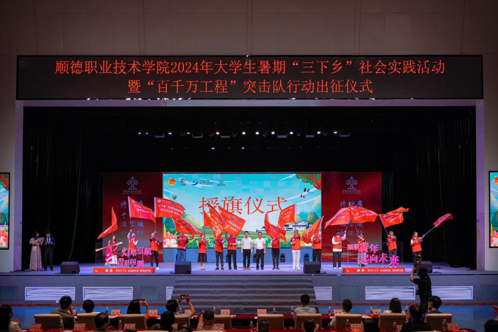 在暑期“三下乡”社会实践活动出征仪式上,校团委负责人介绍了学校2024年大学生暑期“三下乡”社会实践活动及青年大学生“百千万工程”突击队行动的计划安排,寄语队员们要坚定理想信念,在学习贯彻习近平新时代中国特色社会主义思想中把牢青春航向;要强化责任担当,在锐意进取的躬身实践中展现青春作为;要发挥专业优势,在服务高质量发展的一线展现青春风貌。随后,全体突击队成员庄严宣誓,领导嘉宾为出征队伍授旗。接下来,各支队伍将紧扣广东省“百千万工程”中心任务,围绕绿美广东、美丽乡村等专项,奔赴全省各地开展社会实践服务,把准时代脉搏、展现职院担当,为全面推进乡村振兴、构建城乡区域协调发展新格局贡献青春力量。