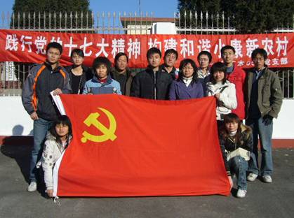 党的十七大召开以来,全国上下掀起学习十七大精神的热潮。在此期间,我校各个学生党支部做出积极响应,组织开展各种形式的活动,在实践中学习、领会十七大精神。化工学院、外语系、数理系、工商管理学院的部分学生党支部,走进顺义区豹房村、龙湾屯村等结对村党支部,紧密结合十七大精神,开展“践行党的十七大精神,构建和谐小康新农村”的红色“1+1”主题实践活动。