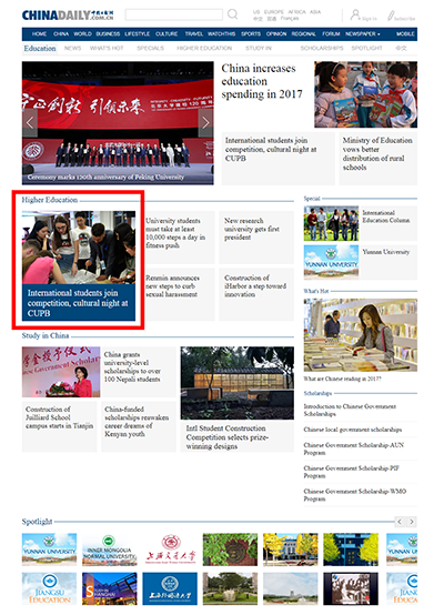中国日报网(英文)Education频道首页以