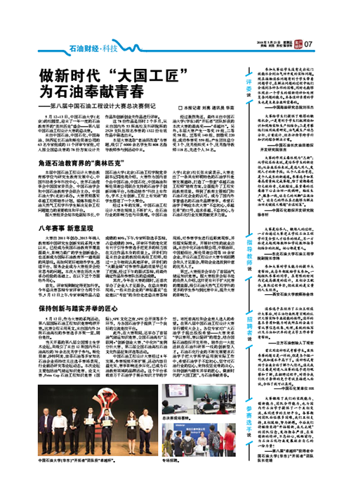 5月23日出版的《石油商报》第7版整版以“做新时代‘大国工匠’ 为石油奉献青春——第八届中国石油工程设计大赛总决赛侧记”为题对第八届中国石油工程设计大赛进行了报道