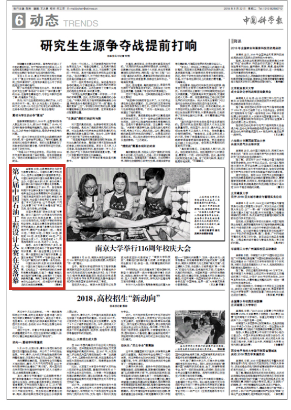 5月22日出版的《中国科学报》第6版以“第八届中国石油工程设计大赛在京落幕”为题对第八届中国石油工程设计大赛进行了报道