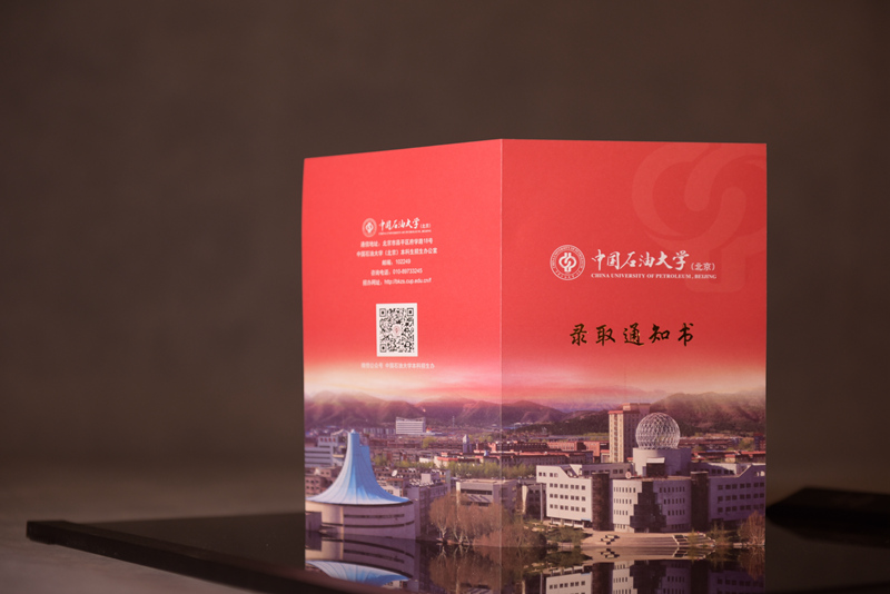 石大录取通知书守正于传统之中,出新于法度之内。亮眼的红色是石大从遥远军都山麓传递而来的喜讯。封面是美丽的石大标志性建筑体育馆和图书馆。烫金大字“录取通知书”大气端庄,通知书内页风格清新典雅,内容简单明了。“厚积薄发 开物成务”是石大校训,左侧是石大鸟瞰图,与封面遥相呼应,在简约、简洁中蕴含喜意,贯注着校训和“实事求是,艰苦奋斗”的校风。