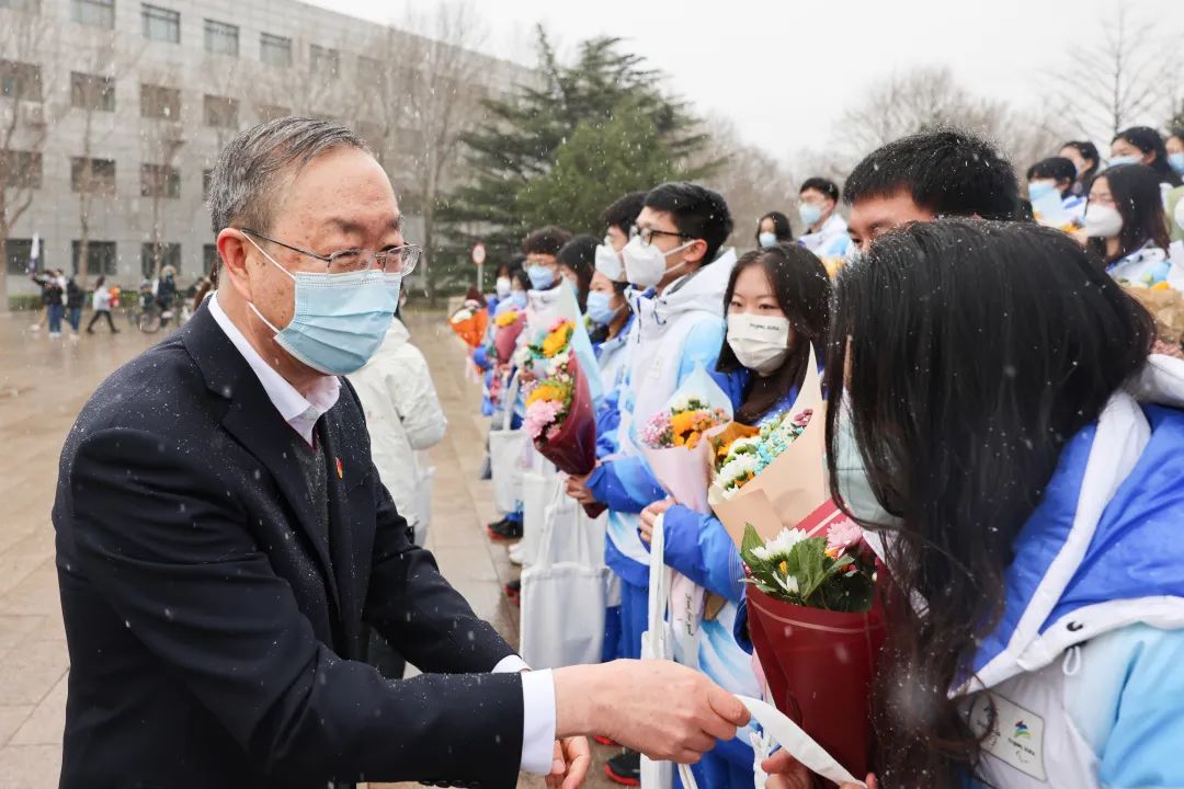 陈峰向归来的志愿者表示亲切问候,他说,在这堂冰雪上的“大思政课”中,中石大志愿者践行了“请党放心,冬奥有我”的铮铮誓言,是“最有执行力、最有战斗力、最有爱国情、最有荣校志”的中石大青年代表。他表示,同学们生逢其时,能够服务冬奥会、冬残奥会很幸运,希望同学们带着这份收获和荣耀,在未来的人生道路上谱写更多精彩华章。