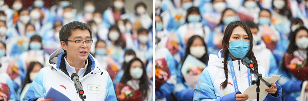 教师志愿者代表、地球物理学院团委书记王天讲述了自己在志愿工作过程中感受到的自豪、温暖和希望的故事。学生志愿者代表、外国语学院2019级本科生陈江宇表示将继续开拓创新、锐意进取,讲好中石大冬奥志愿故事。
