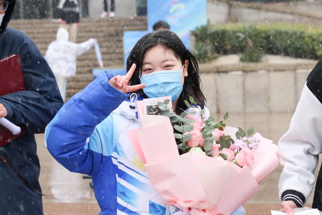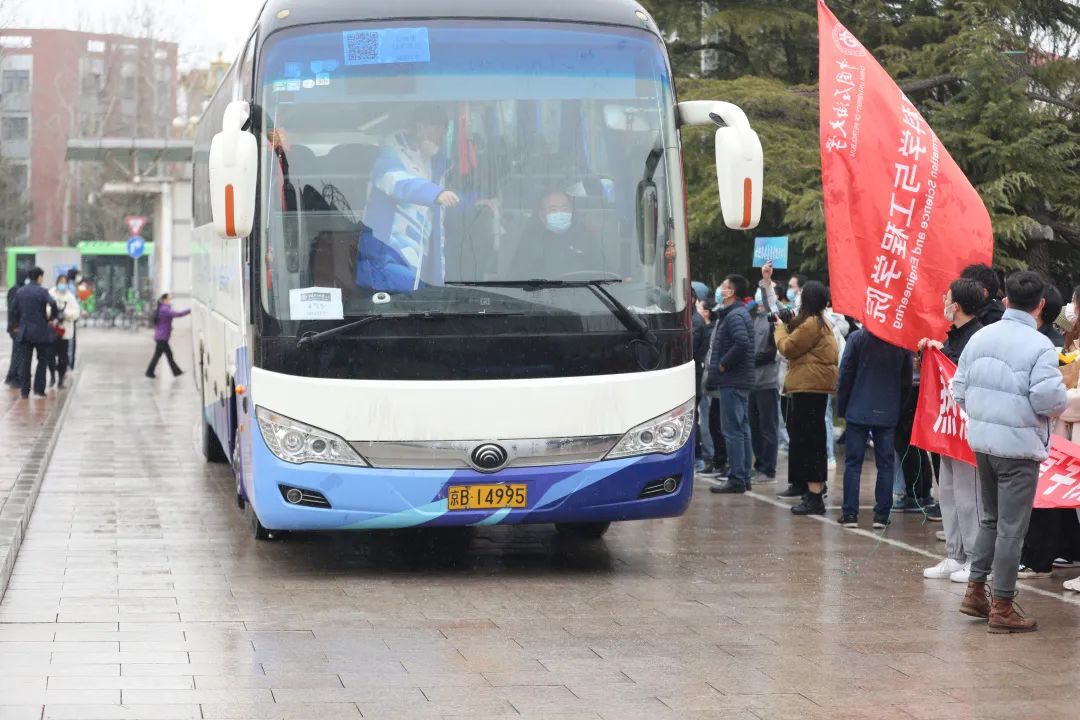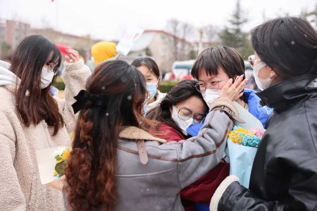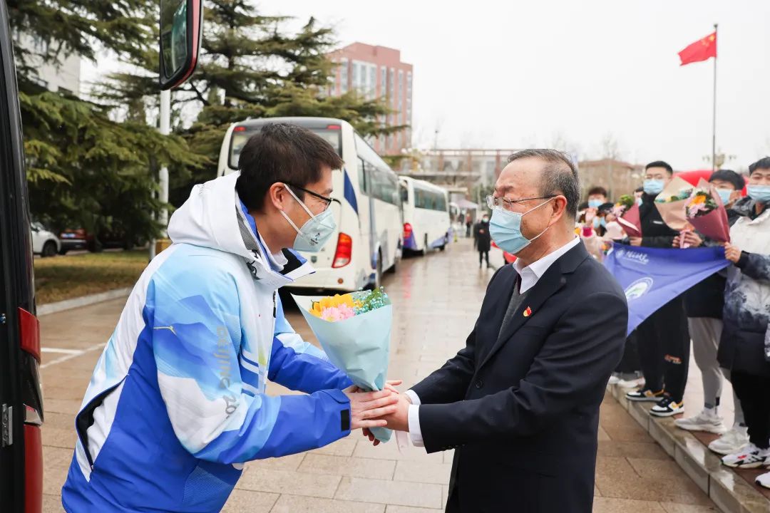 学校6辆大巴车载着第一批返校的99名志愿者驶入校园。前来迎接的师生深情演唱歌曲《一起向未来》《雪花》,并将一束束象征着生机、活力的向日葵献给志愿者。