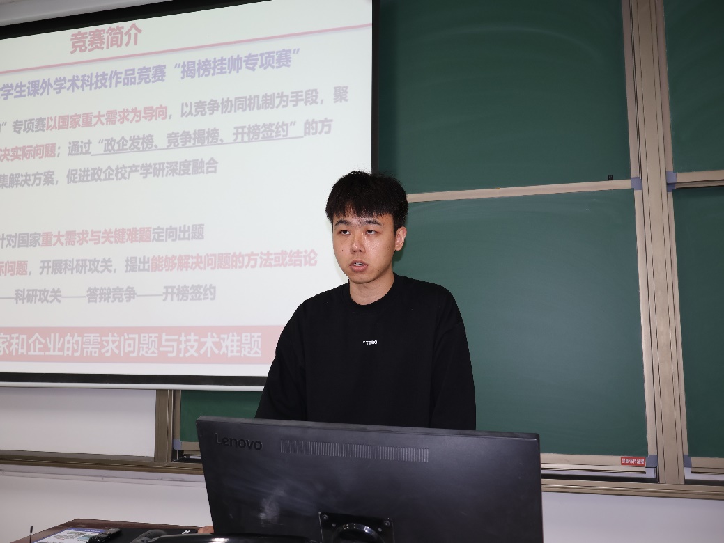李文豪重点讲解了“挑战杯”的时间表和路线图。通过梳理“挑战杯”的赛制赛道、时间节点,他为全体同学讲清了“挑战杯”是什么、为何参加、如何备赛三个基本问题,并希望大家在不同赛道跑出最好成绩。