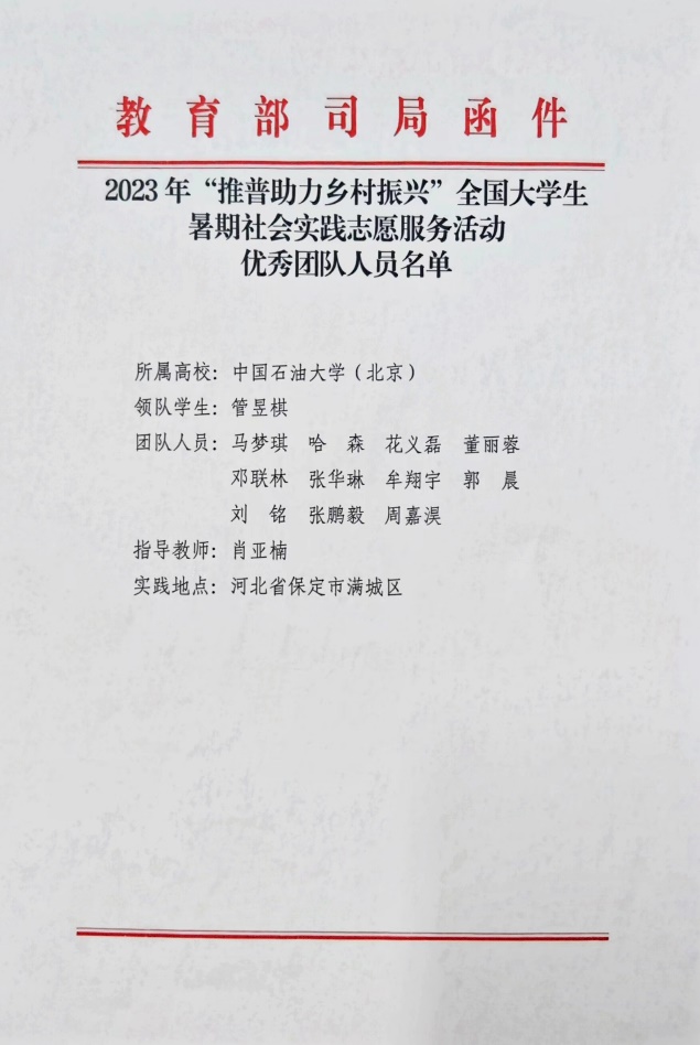 近日,由教育部语言文字应用管理司、共青团中央青年发展部共同主办的2023年“推普助力乡村振兴”全国大学生暑期社会实践志愿服务活动评优结果揭晓。中石大石油工程学院“油Young青年”推普实践团队荣获“优秀团队”称号,并收到教育部和团中央的来信表扬。