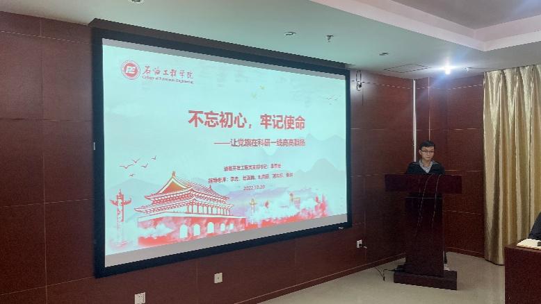油藏开发工程党支部书记裴雪皓以“不忘初心,牢记使命——让党旗在科研一线高高飘扬”为主题进行分享,以党的二十大报告中对青年工作的要求出发,分别从思想引领、专业培养、实践育人三个方面分享支部建设三位一体战斗堡垒的经验。随后,与会人员积极发言讨论并分享感悟。