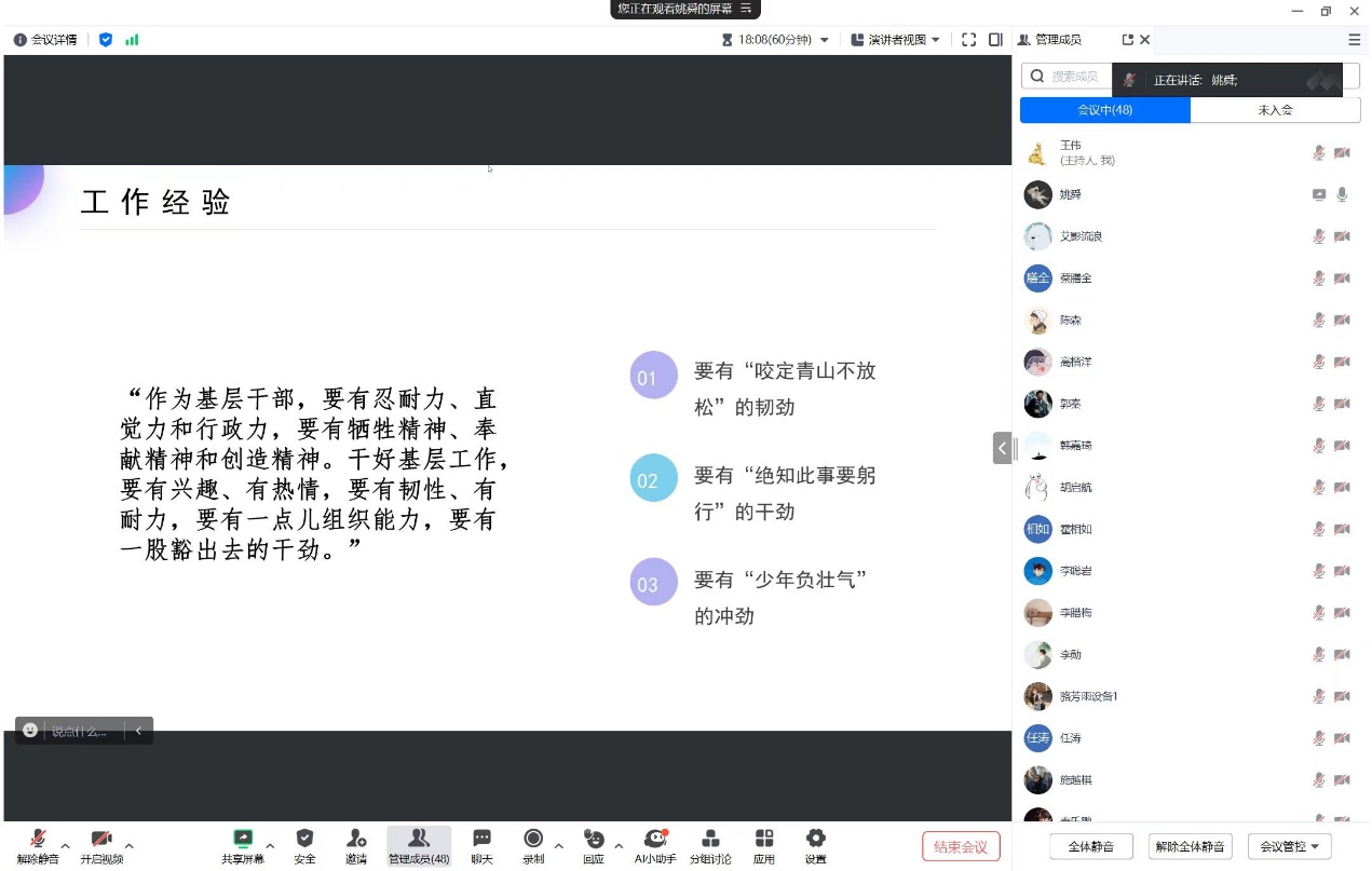 会上,姚舜对自己校园生活、考公准备及基层服务三个阶段经历进行了分享,并重点讲述了自己公务员备考的成功经验以及作为公职人员在基层为人民服务的难忘事迹。鼓励大家要勇于面对学习生活工作中的各种挑战和困难,坚定理想信念,保持专注,向着自己的既定目标奋勇前进。