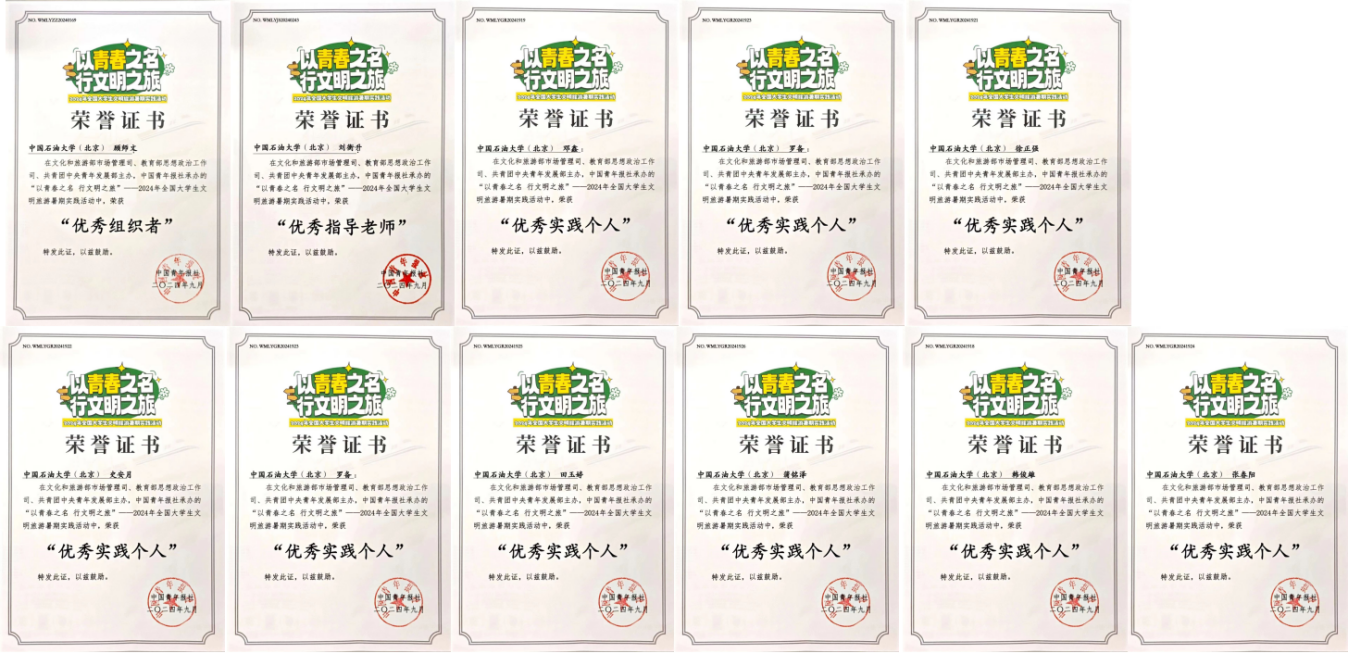近日,由文化和旅游部市场管理司、教育部思想政治工作司、共青团中央青年发展部联合主办,中国青年报社承办的“以青春之名,行文明之旅”——2024年全国大学生文明旅游暑期实践活动圆满落幕。石油工程学院青“石”助湘行实践团在此活动中表现突出,荣获佳绩!
