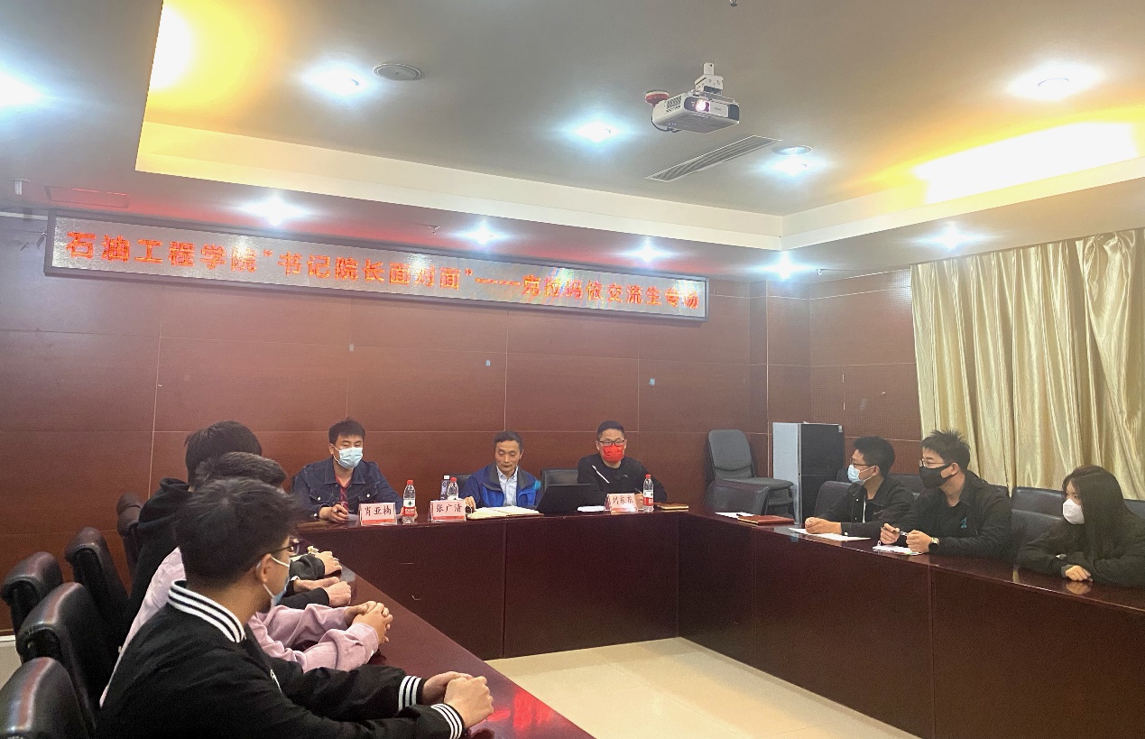 4月5日下午,石油工程学院在中油大厦310会议室召开“书记、院长面对面”克拉玛依校区交流生专场座谈会。学院院长张广清、党委副书记刘东东、团委书记肖亚楠、相关辅导员和学院克拉玛依校区全体交流生参会。