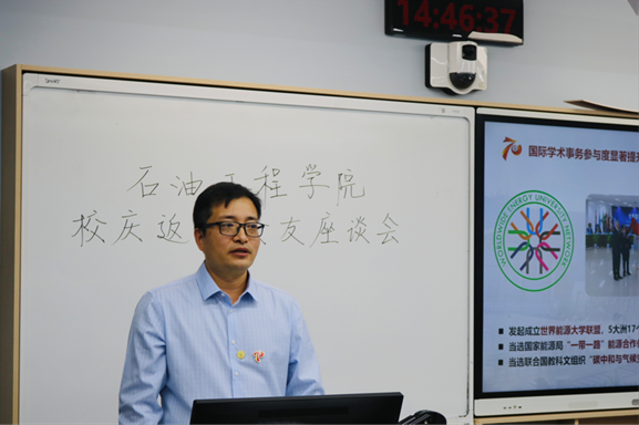 宋先知介绍了近年来学校的新风貌、学院的新发展和学院未来的布局规划。他表示,习近平总书记三年两回信为中石大的事业发展给予了高度肯定,指明了前进方向。学院在学科专业、师资队伍、人才培养、科学研究、国际合作交流、党建与文化建设等多方面取得一系列突破性进展。未来学院将重点围绕人才培养、科研创新、学科发展持续发力。
