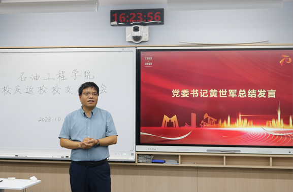 黄世军最后总结,再次欢迎各位校友在校庆70周年之际能齐聚一堂,共忆石工故事,感谢广大校友关心和支持学院发展,希望校友们能继续为学院和学科的高质量发展建言献策,为建设能源领域特色鲜明的世界一流研究型大学不断贡献力量。