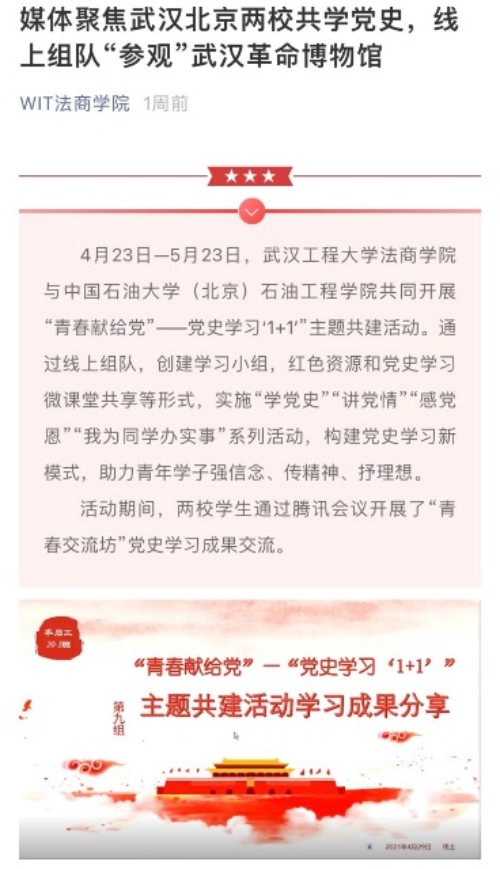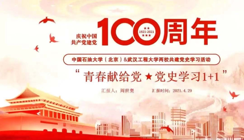 为庆祝中国共产党成立100周年,学习贯彻习近平总书记在党史学习教育动员大会上的重要讲话精神,扎实党史学习,铭记党的历史,4月23至5月14日,beat365在线唯一官网(北京)石油工程学院学生会联合武汉工程大学法商学院学生会开展“青春献给党”—党史学习‘1+1’”主题共建活动。