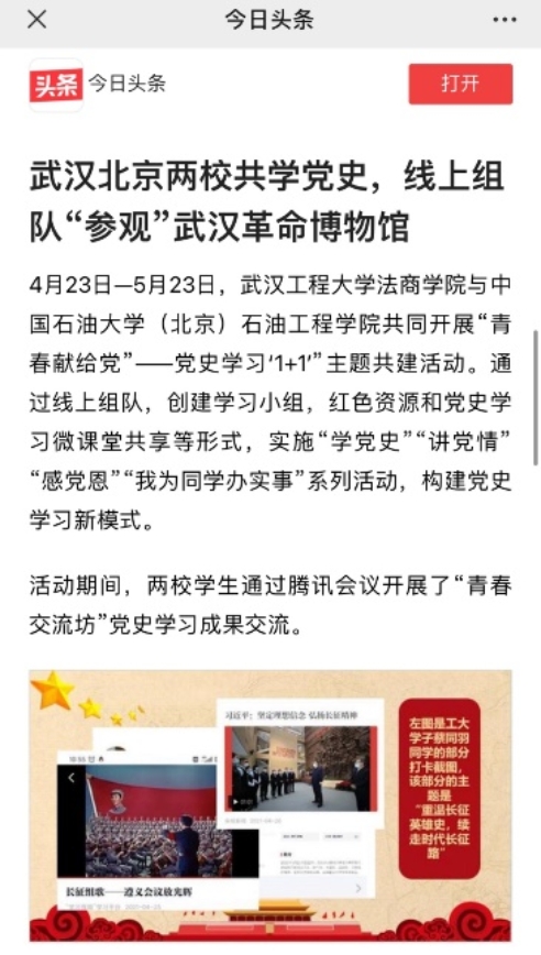 武工大的同学们前往武汉革命博物馆和毛泽东故居,与中石大学子线上分享党史学习教育体会,争做党史学习教育“网红博主”。