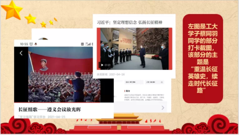 第一步,“青春补给站”,学党史,强信念,永葆红色初心。两校学生建立“1+1”线上互学小组,通过阅读党史著作、观看主题视频、参观线上展览等形式,在党史学习官网、学习强国APP等媒体平台开展一周党史学习。互学小组以党史学习内容截图进行每日打卡,同时交流彼此的学习生活情况,积极分享两校的校园文化。