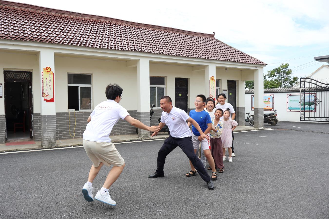服务队志愿者与孩子们开展“老鹰捉小鸡”趣味体育活动