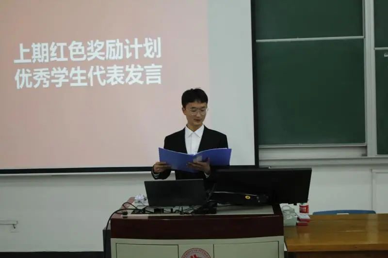 第一期红色奖励计划优秀学生代表王一帆发言,他给2020级本科生们分享了自己对红色奖励计划的理解并且提供了参与红色奖励计划的指导性建议。激励大家统筹活动安排,做好规划,提升综合素质。