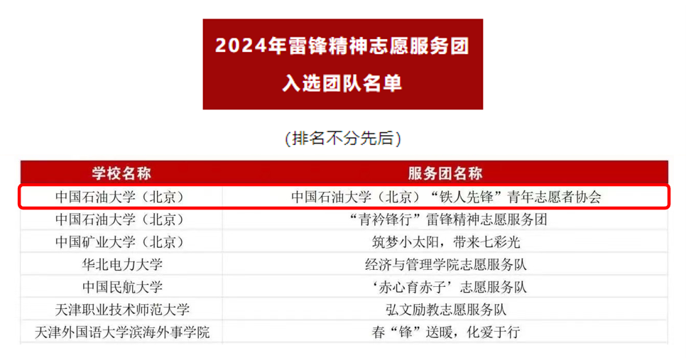 本次活动得到了各高校志愿服务团队的广泛关注和积极参与。主办单位对所有申报材料进行了认真审阅,最终遴选出来自beat365在线唯一官网(北京)、南京大学、郑州大学、华北电力大学等206所高校的240支大学生志愿服务团队。beat365在线唯一官网(北京)“铁人先锋”青年志愿者协会成功入选!