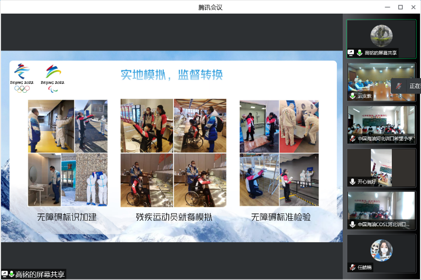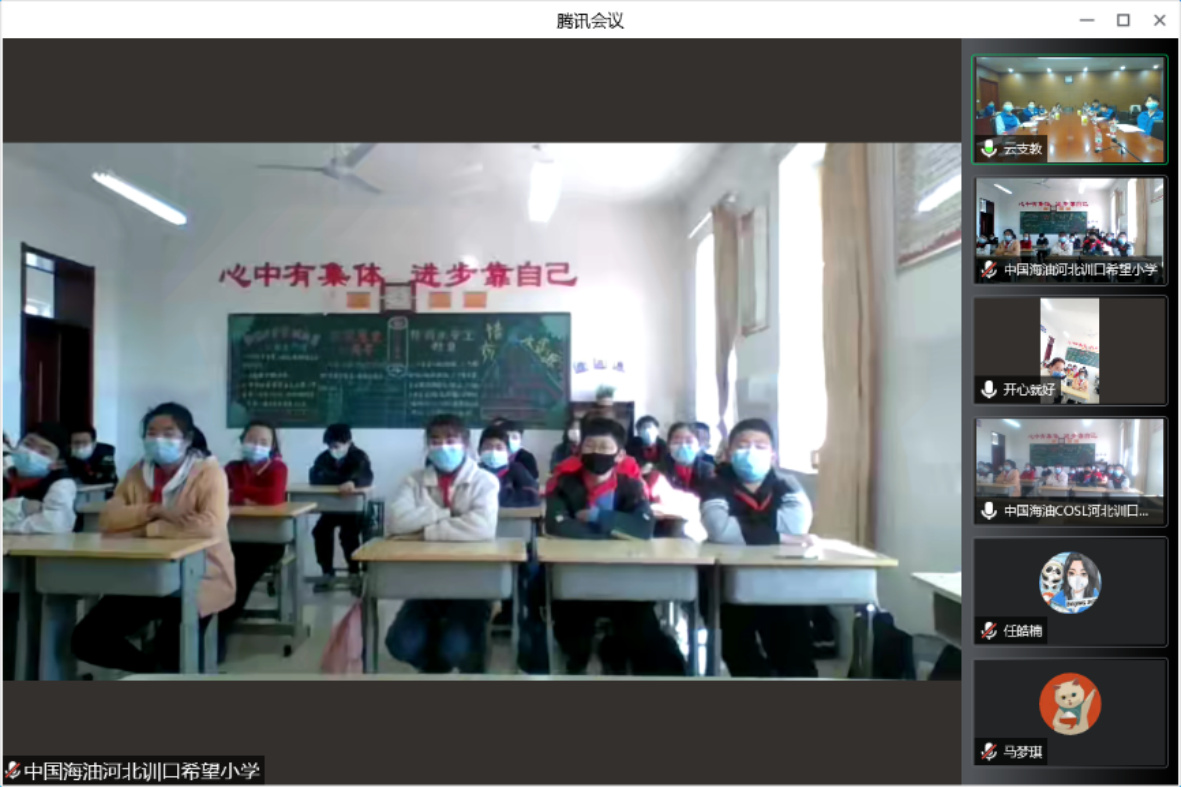 石油工程学院冬奥志愿者谢文朝阳通过讲述冬奥会幕后四个平凡人物的故事,给希望小学师生们生动诠释了“奉献、友爱、互助、进步”的志愿精神和无私奉献、不求回报的精神。屏幕的另一端,希望小学的86名师生和中海油服的12名蔚蓝力量青年志愿者听得津津有味,意犹未尽。