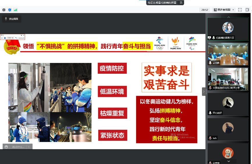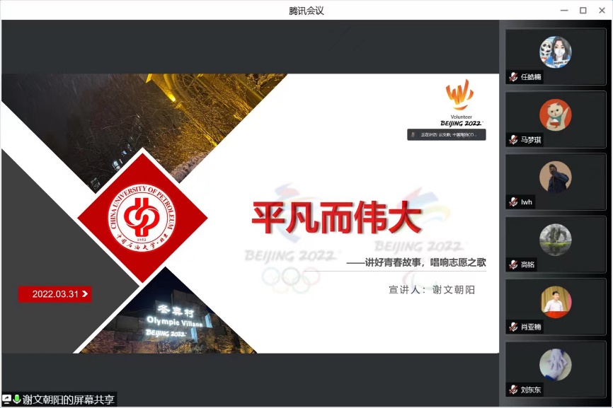 为弘扬冬奥精神,庆祝建团百年,3月31日,石油工程学院团委与中海油服团委联合举办了“庆建团百年,创美好未来”的“云支教”活动,来自石油工程学院的冬奥志愿者和中海油服天津分公司蔚蓝力量志愿者为中国海油训口希望小学的学生们送上了一堂“冬奥”主题的特色爱心网课。