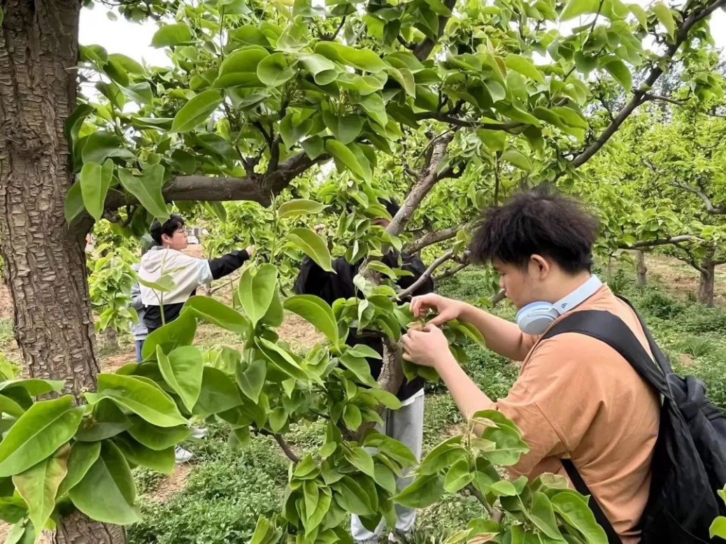 组织志愿者前往学院劳动教育实践基地——中卡友好生态园,开展为苹果树疏花、果园除草松土义务劳动,帮助苹果树克服大小年结果,确保丰产、稳产,提高坐果率;