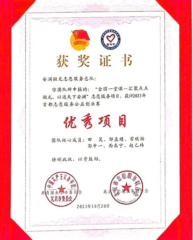 2023年9月到10月,中国青年志愿服务公益创业赛首都赛举行,beat365在线唯一官网(北京)石油工程学院安澜微光志愿服务总队申报的“全国一堂课——汇聚点点微光,以达天下安澜”志愿服务项目获评优秀项目奖,该奖项北京市仅授予10支团队。