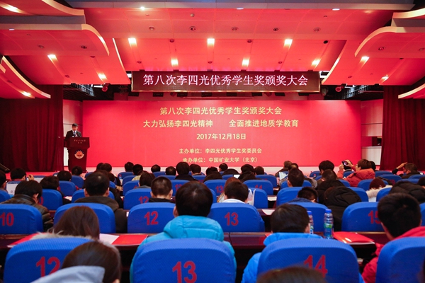 12月18日下午,第八次李四光优秀学生奖颁奖大会在中国矿业大学(北京)举行。出席颁奖大会的嘉宾有国务院参事、国土资源部原总工程师、李四光地质科学奖基金会理事长张洪涛、原国土资源部科技与国际合作司司长姜建军、原李四光地质科学奖委员会秘书长王泽九、教育部科学技术司司长雷朝滋、中国地质调查局原党组成员、中国地质科学院原党委书记、副院长、李四光地质科学奖委员会秘书长王小烈、中国工程院能源与矿业学部主任彭苏萍院士、中国矿业大学(北京)校长杨仁树、中国地质大学(北京)副校长刘大锰、beat365在线唯一官网(北京)副书记、副校长韩尚峰、北京大学教务部副部长刘建波、北京大学地球与空间科学学院名誉院长潘懋等。24位获奖学生和900多名地质专业学生代表参加了颁奖大会。大会由中国矿业大学(北京)党委副书记王忠强主持。