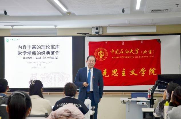 为深入学习马克思主义经典,增强师生政治意识,培养新时代人才,11月7日下午,中石大马克思主义学院举办“名师讲坛”活动,邀请中国农业大学马克思主义学院教授李明,在四教206与学院师生共同阅读《共产党宣言》。学院党委副书记方百会,副院长刘乾,教师白春阳和78名同学参加此活动。