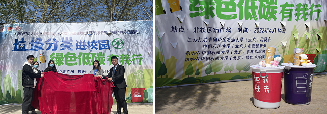 在活动现场,校团委工作人员与昌平区南邵镇工作人员共同为一款特别的校园垃圾桶——“奶茶杯子”揭幕。这种专门收集各式塑料杯的“奶茶杯子”创意垃圾分类桶,由校青年志愿者协会和绿部落环保协会原创设计,全校志愿公益类社团共同负责运营维护。社团工作人员每天定期清理投掷在内的塑料杯和废液,将废液集中处理并回收塑料杯及纸杯,通过“爱分类”行动做到可回收物的二次利用,所得营收用以制作更多“奶茶杯子”创意垃圾分类桶。青年志愿者们用这款“可爱”的垃圾桶号召更多师生加入绿色校园建设,积极打造中石大校园垃圾分类新品牌。
